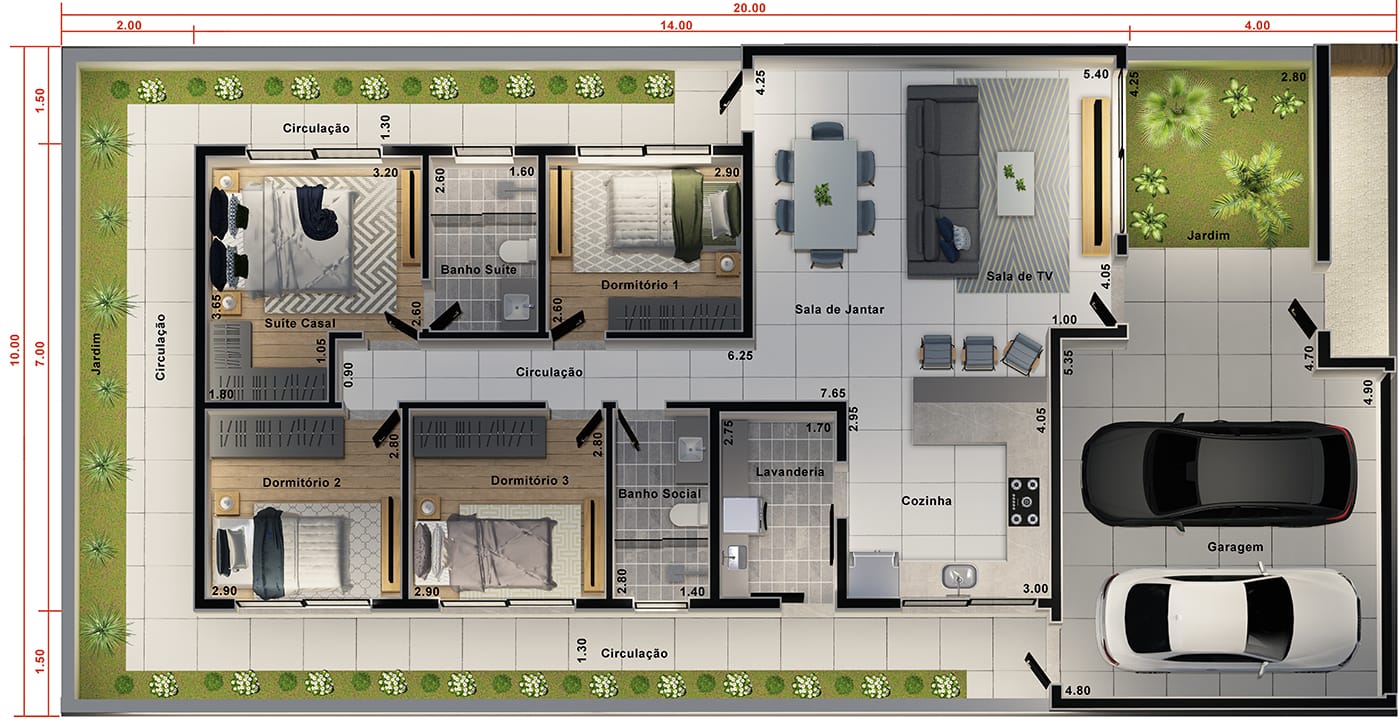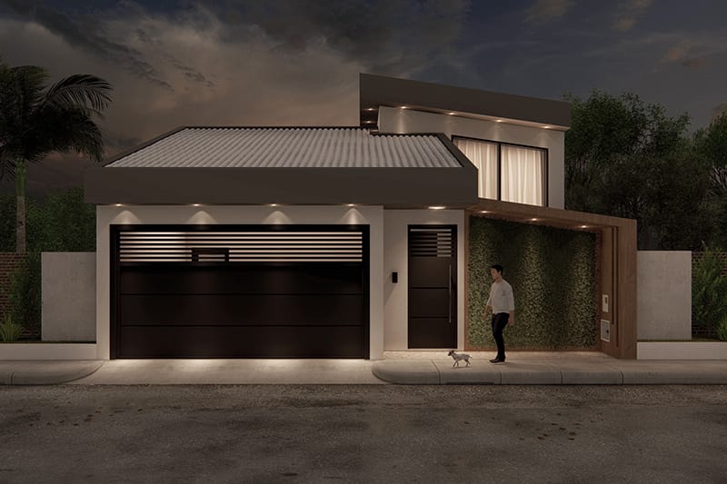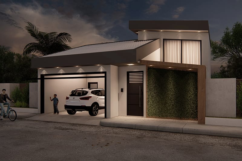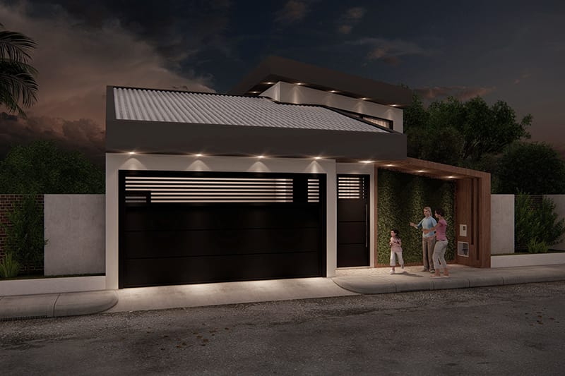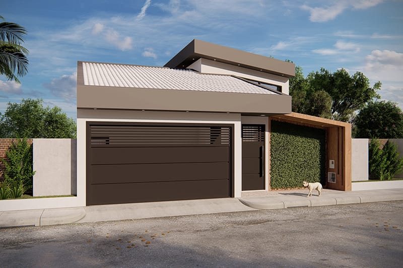 A fachada dessa casa oferece um design assimétrico que vai atrair os olhares do seu bairro. Temos um pé direito alto onde fica a sala de TV e a sala de jantar. Devido à altura do ambiente, temos uma janela para entrada de luz natural e ventilação. Esse cômodo é integrado a cozinha, onde temos uma bancada para refeições rápidas, uma cozinha em U e também uma porta de acesso à lavanderia, facilitando a locomoção. Depois da cozinha, temos um corredor de acesso ao banho social e a área intima da casa, onde encontramos os 3 dormitórios e a suíte master. Os 3 dormitórios tem layouts semelhantes, com espaço para cama, armário e decoração de acordo com o dono do quarto. A suíte master é perfeita para o casal, incluindo espaço suficiente para um grande guarda roupa e o painel de TV. O banho é bem espaçoso, se tornando bem confortável para o casal. Esse é o projeto 176, com uma fachada diferente de tudo que já fizemos e uma planta eficiente e prática, prezando pelas coisas do dia a dia.